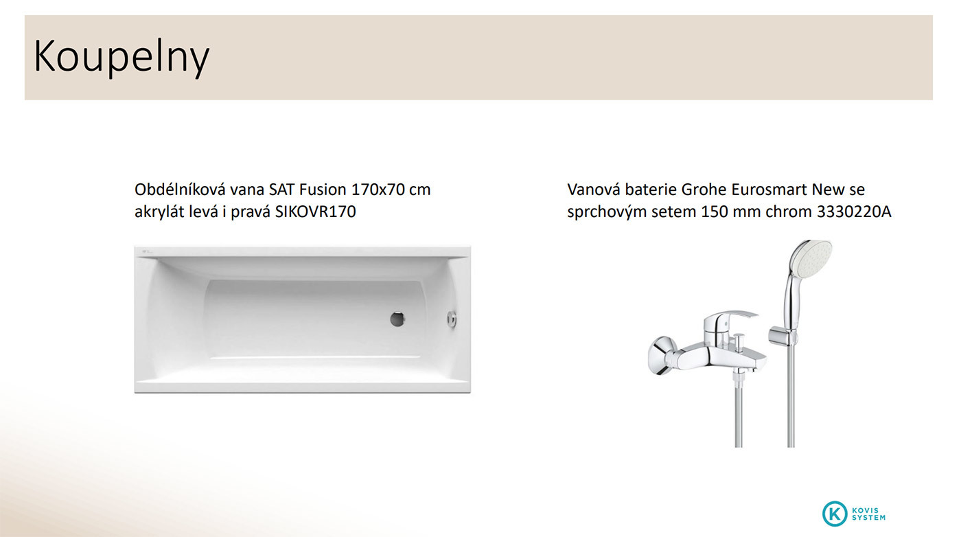 - Topení – kompletní rozvod včetně kotle elektro 9KW, radiátorový typ a otopná tělesa Radik v každé obytné místnosti, v koupelně vždy počítáno s otopným žebříkem (při změně na podlahové topení Ivar není žádná změna ceny)