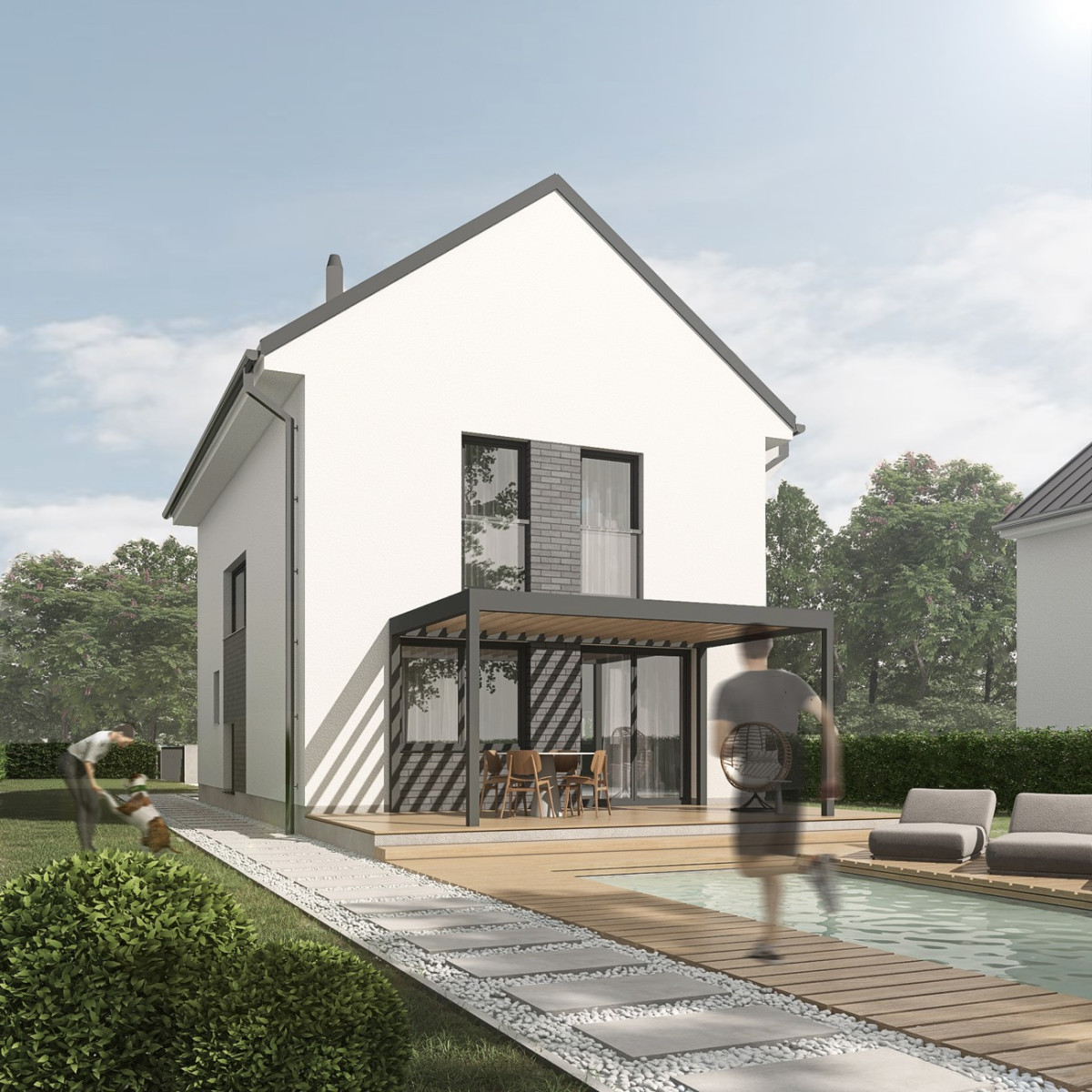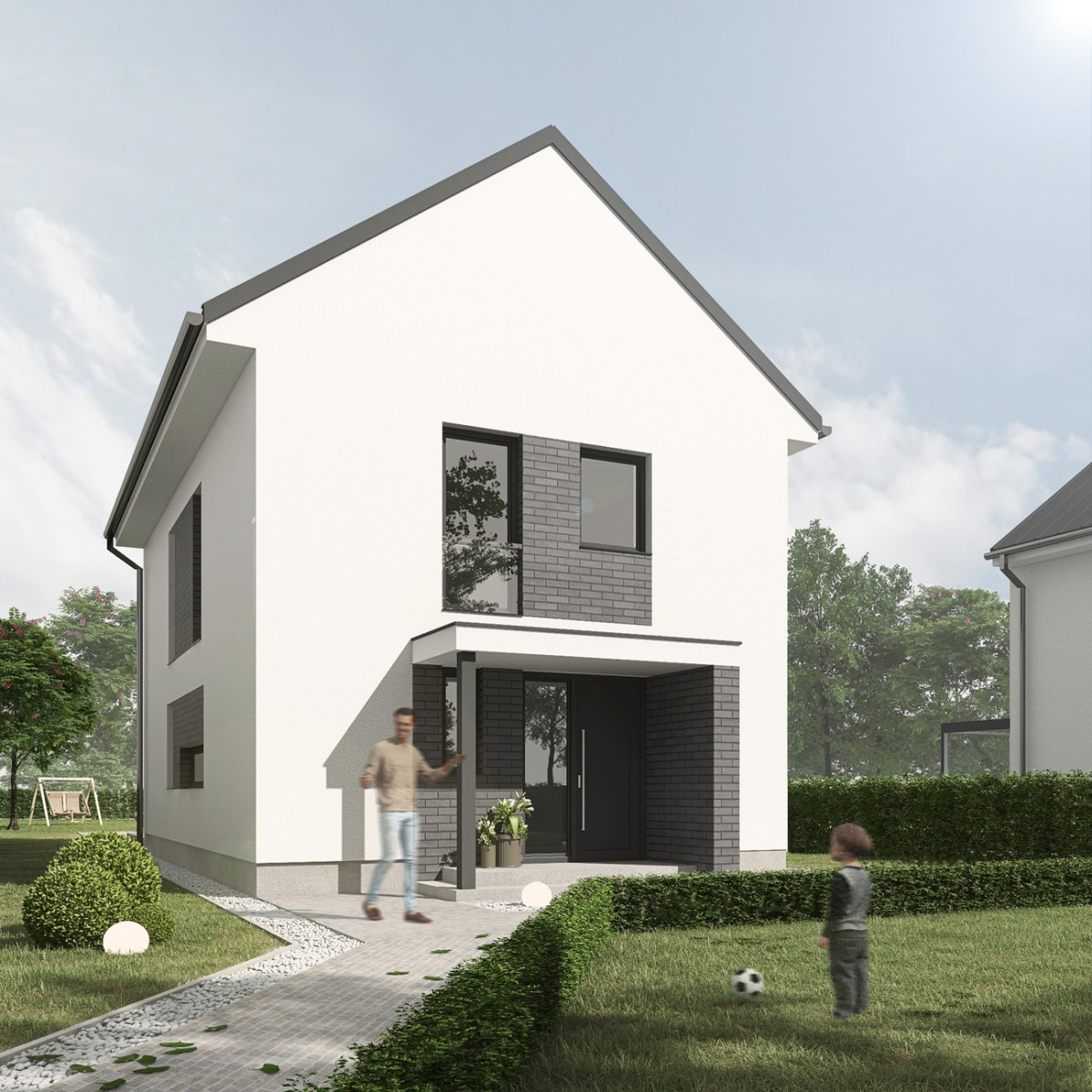 Všechny domy mají dispozici 4+kk, 100 m2, avšak je možné rozšířit je podle vašich individuálních potřeb. Domy jsou navrženy s ohledem na nízkou energetickou náročnost ,,B” a výhodné náklady na provoz. Střecha je sedlová. Kotel je elektrický s možností konverze na tepelné čerpadlo. Solární panely jsou k dispozici včetně možnosti vyřízení dotace. Domy jsou samostatně stojící s vlastními pozemky a kompletními přípojkami – kanalizace, voda, elektřina. Přístup je zajištěn z obecní komunikace.